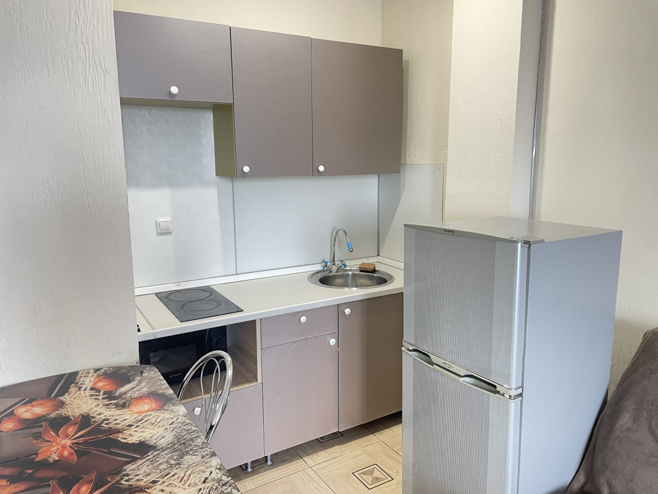 Бытовая техника: телевизор, варочная панель, холодильник двухкамерный, стиральная машина, микроволновая печь.