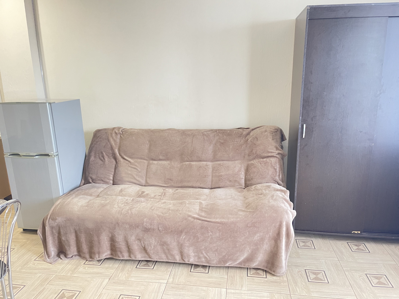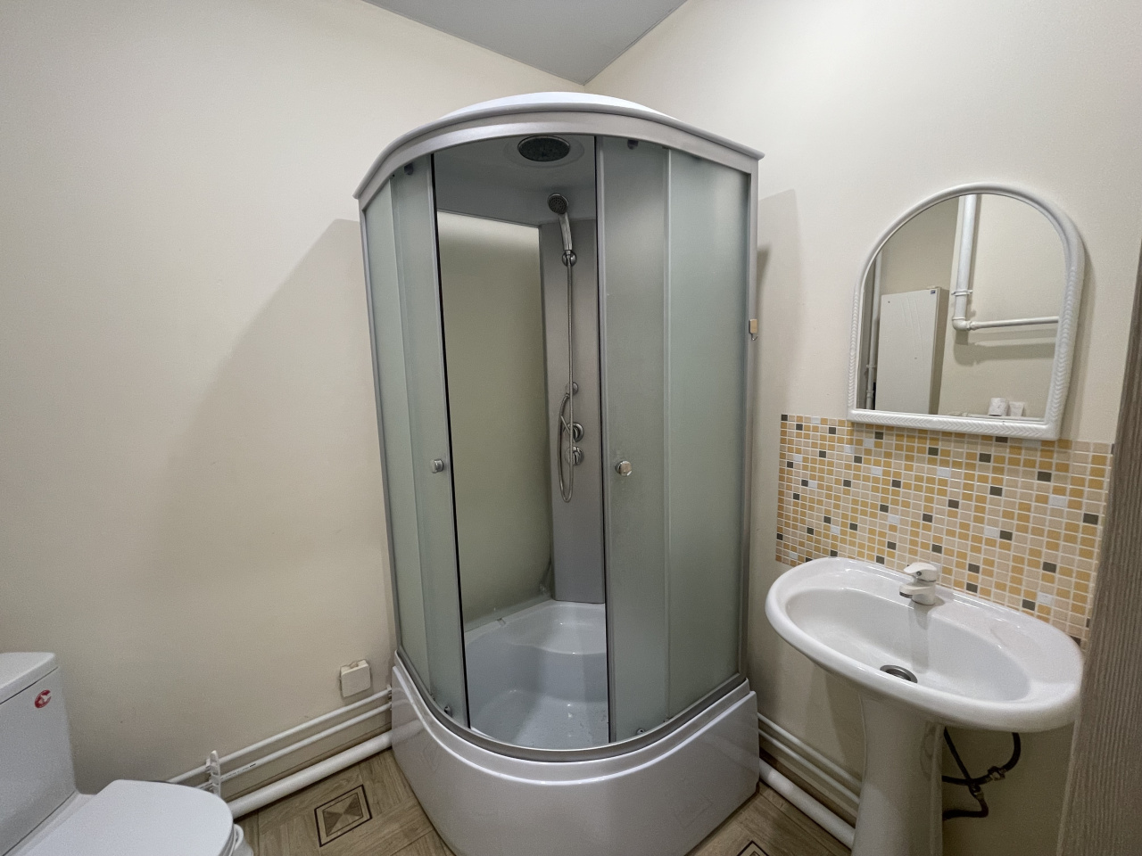 Мебель: раскладной диван, большой шкаф, кухонный гарнитур, стол, 3 стула, зеркала, душевая кабина, сушилка и гладильная доска.